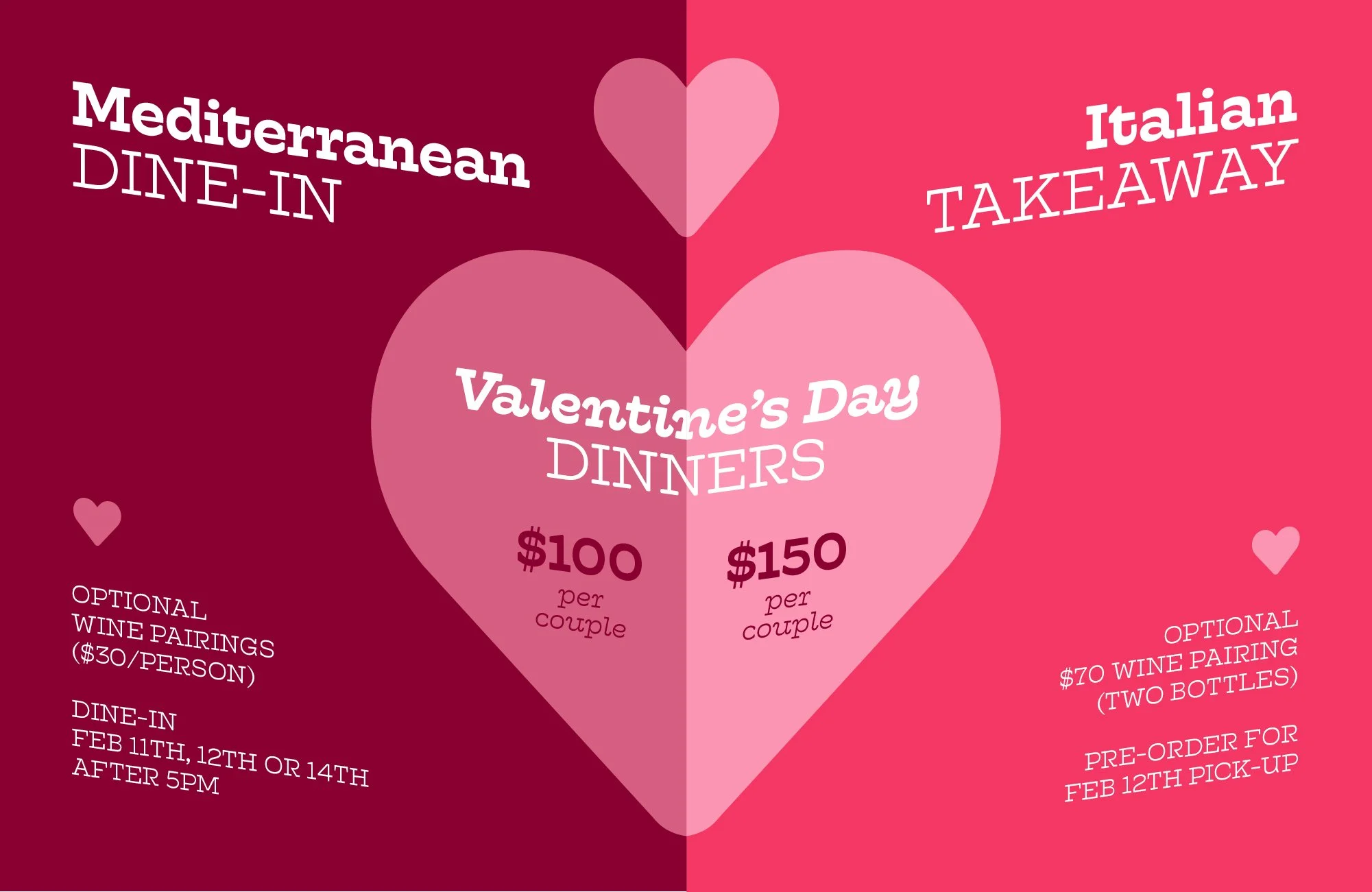 We are offering two Valentine's Dinner this year. One dinner is an Italian themed Takeaway Dinner which follows the format of our other holiday dinners and can be picked up and reheated at home. The other is a Mediterranean themed PRIX-FIXE Dine-In Dinner at the market which you can enjoy on February 11th, 12th or Valentine's Day, February 14th. Our Dine-In dinner will be seated first come, first served. Scroll down to see both menus. Click the ‘ORDER NOW’ BUTTOn at the bottom to pre-order the takeaway dinner.
